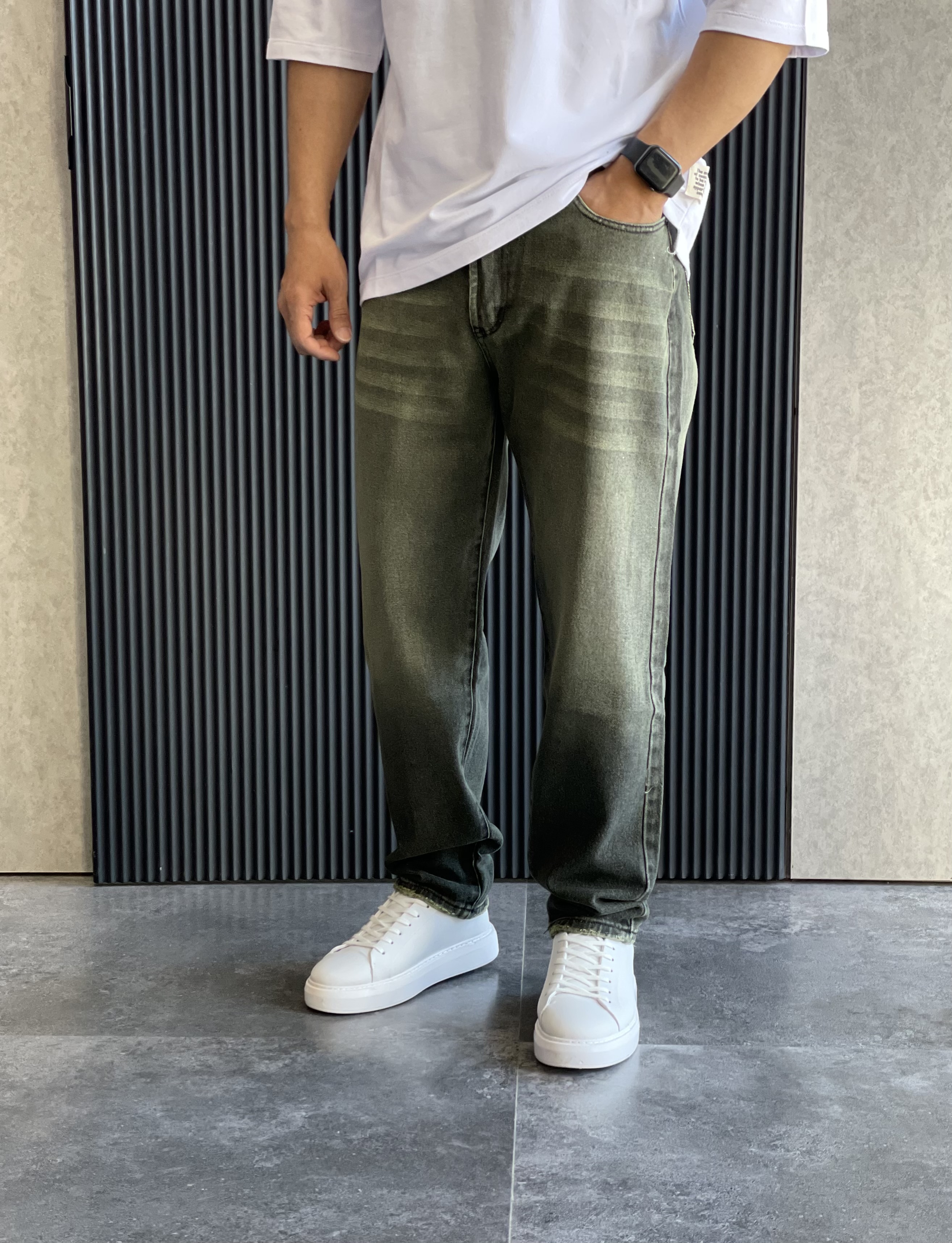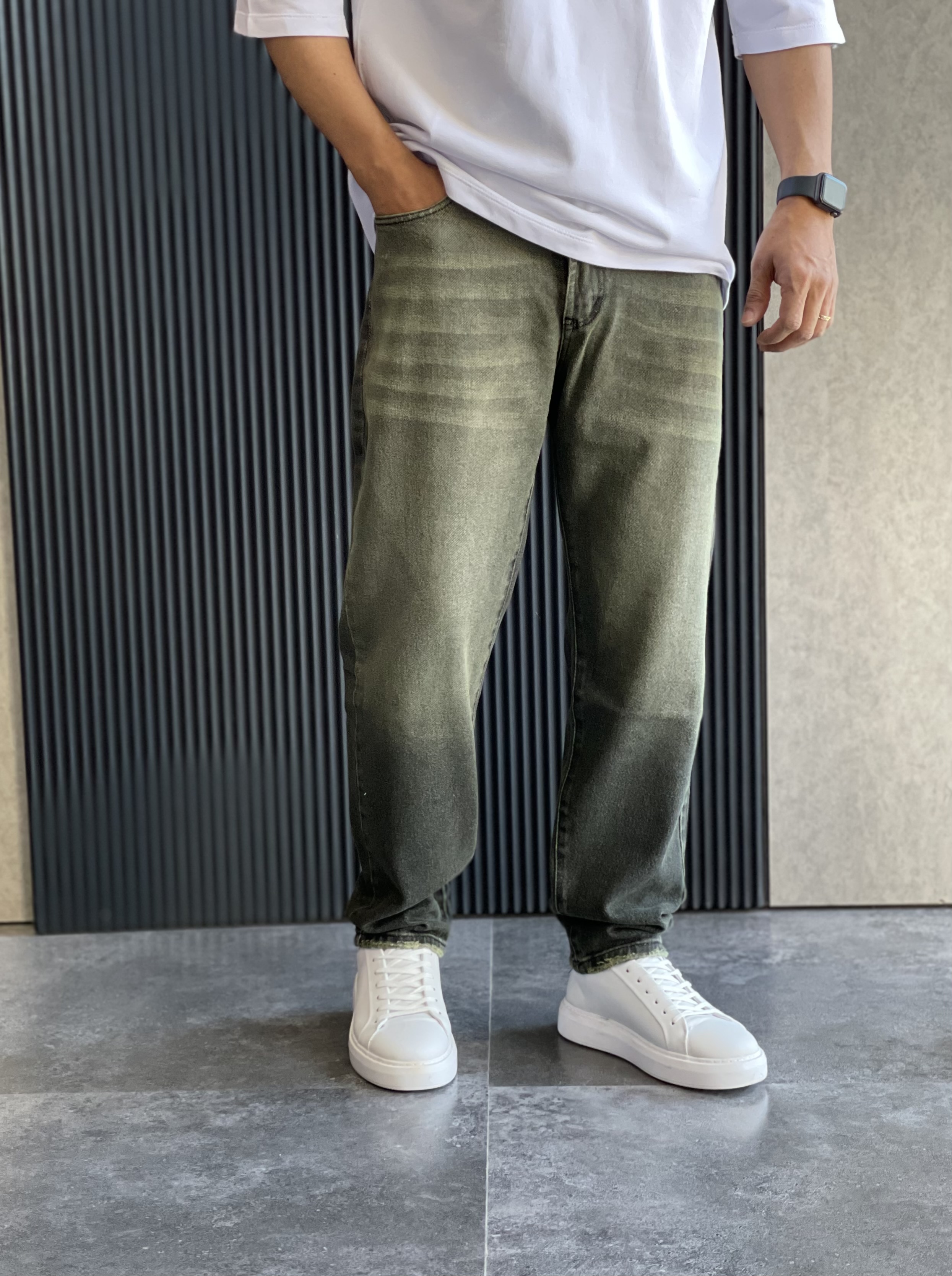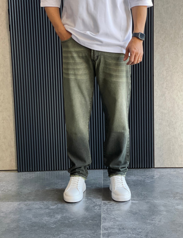 شلوارجین مام استایل با رنگ خاص و جذاب سبز لجنی و سنگشور و رادو بسیار حرفه ای .از دوخت این شلوار از پارچه کجراه ضخیم ترک استفاده شده که در عین ضخامت بسیار نرم و لطیف هست و استایل بسیار شیک و بروزی را برای شما میسازه