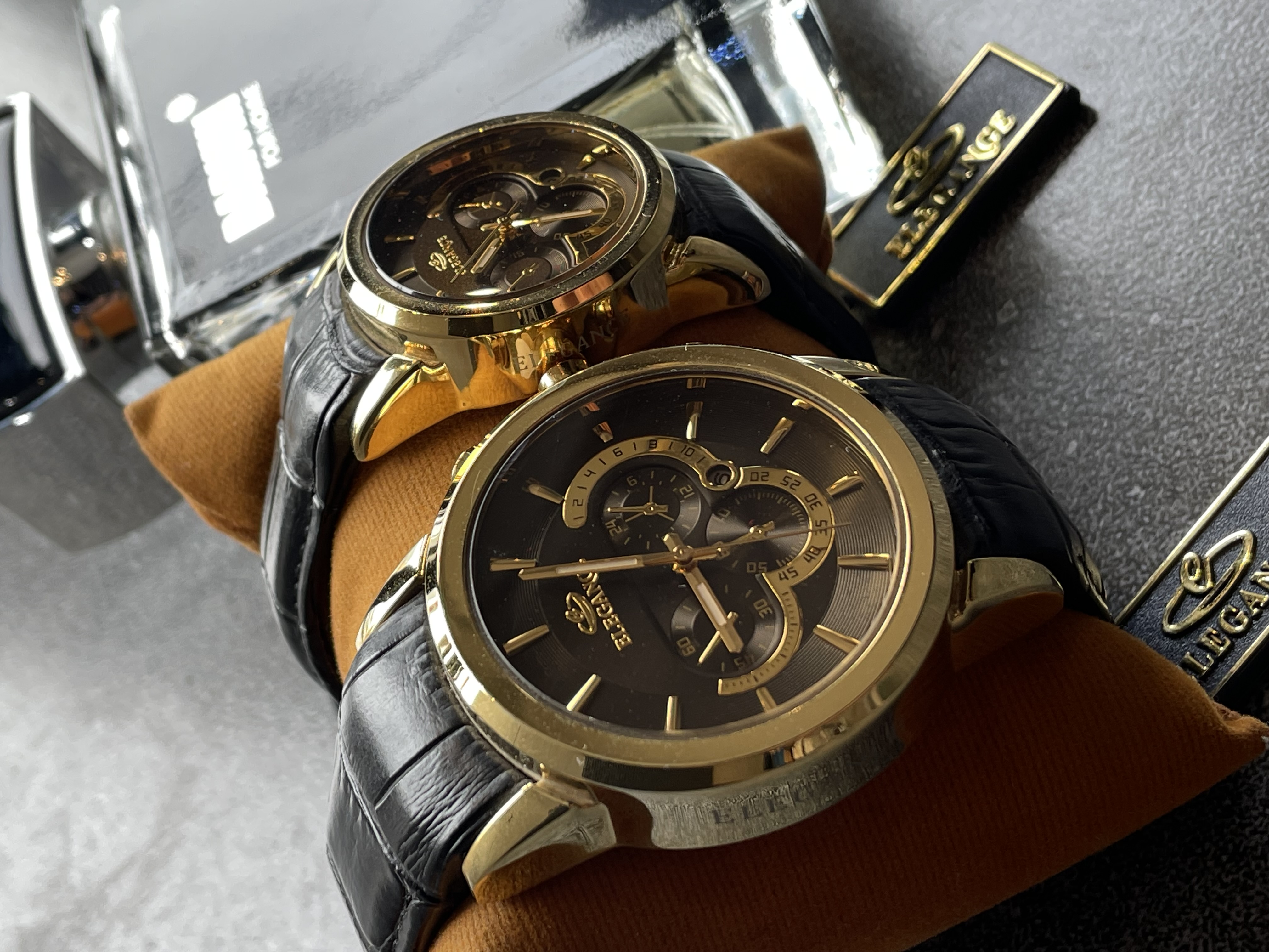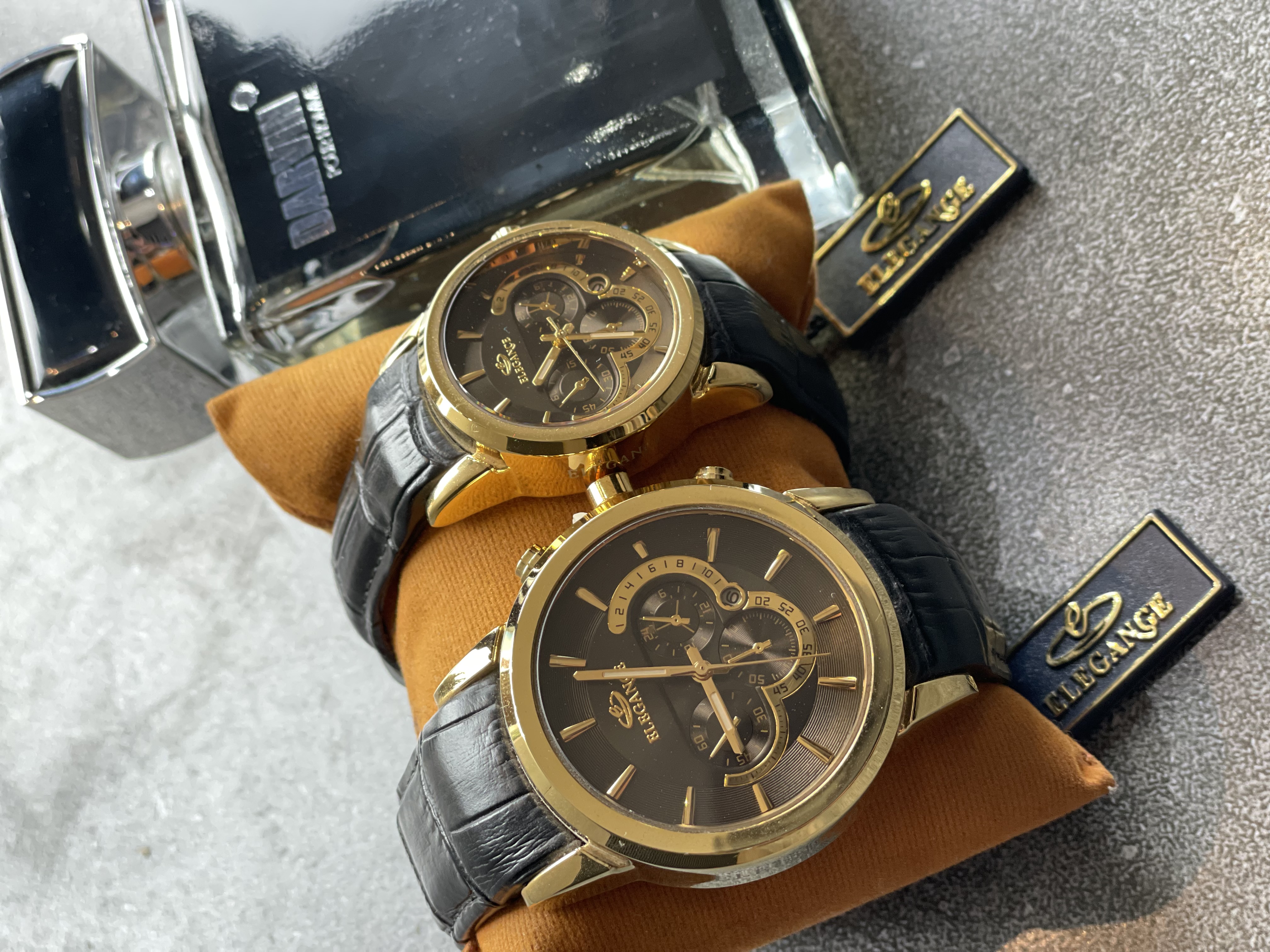 ساعت ست زنانه و مردانه برند الگانس های کپی کاملا مشابه اصلی با بدنه رنگ ثابت و ضد حساسیت و دستبند چرم قفل دار بسیار با کیفیت انتخابی خوب برای هدیه مناسب های خاص.